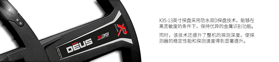2、双D探盘:X35配置了DD防水探测盘,这款坚固却轻巧的探测盘内含35种探测频率,可根据探测环境选择适应的频率使用。