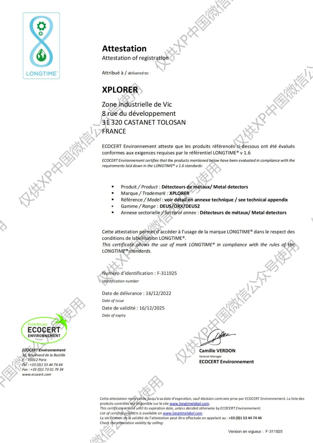 作为金属探测器研发与生产领域的佼佼者,法国XP始终致力于提升产品性能与品质。此次荣获LONGTIME®认证,不仅是对其技术创新的有力证明,更是对其产品质量的广泛认可,为法国XP在金属探测器市场的持续发展奠定了坚实基础。