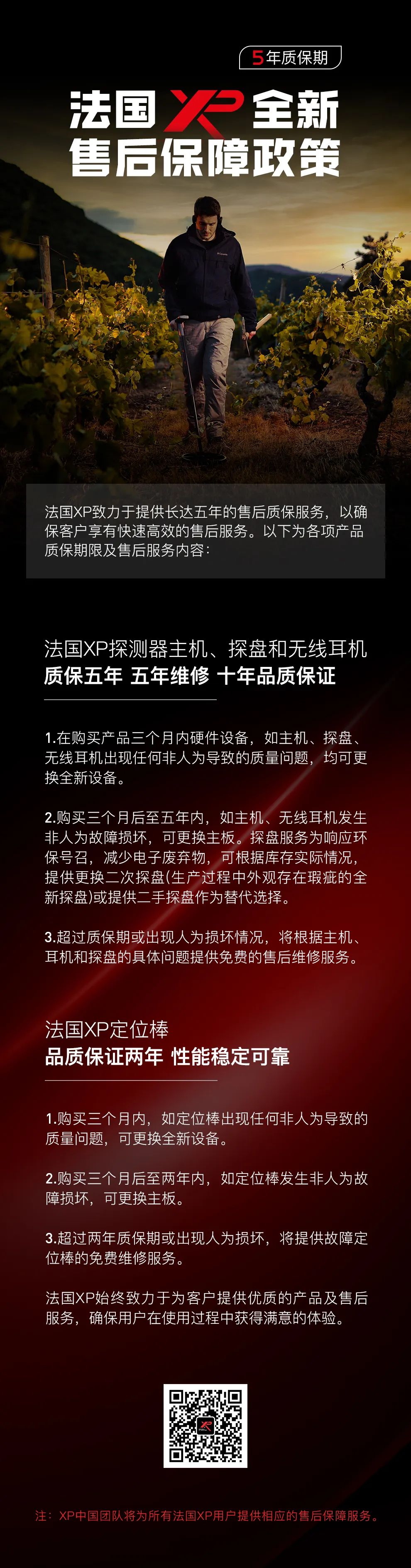 此外,法国XP金属探测器为XP用户提供了相较于其他品牌更为优越的质保服务,质保期限长达5年,充分彰显了其对产品质量的坚定信心。同时,为确保用户能够享受到长期稳定的后端服务,法国XP在生产结束后将继续保留备用配件5年,为用户提供长达10年的全面且可靠的技术支持。这一举措不仅体现了法国XP对用户的长久承诺,更彰显了其作为专业企业的责任与担当。